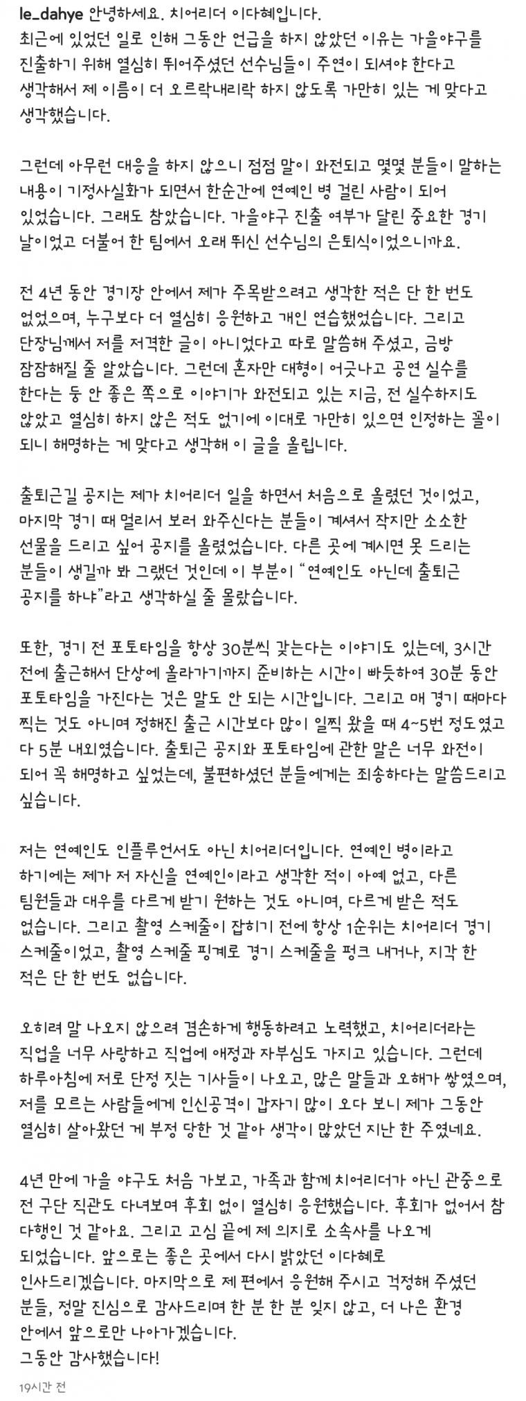 이다혜 치어리더 은퇴