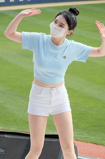 묶은 티셔츠 흰 반바지 우신희 치어리더