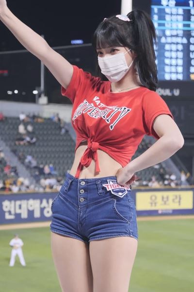 양갈래 머리 가슴 밑으로 묶은 티셔츠 이다혜 치어리더