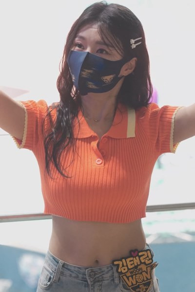 김태린 치어리더 주황 크롭 티셔츠 가슴 무브먼트