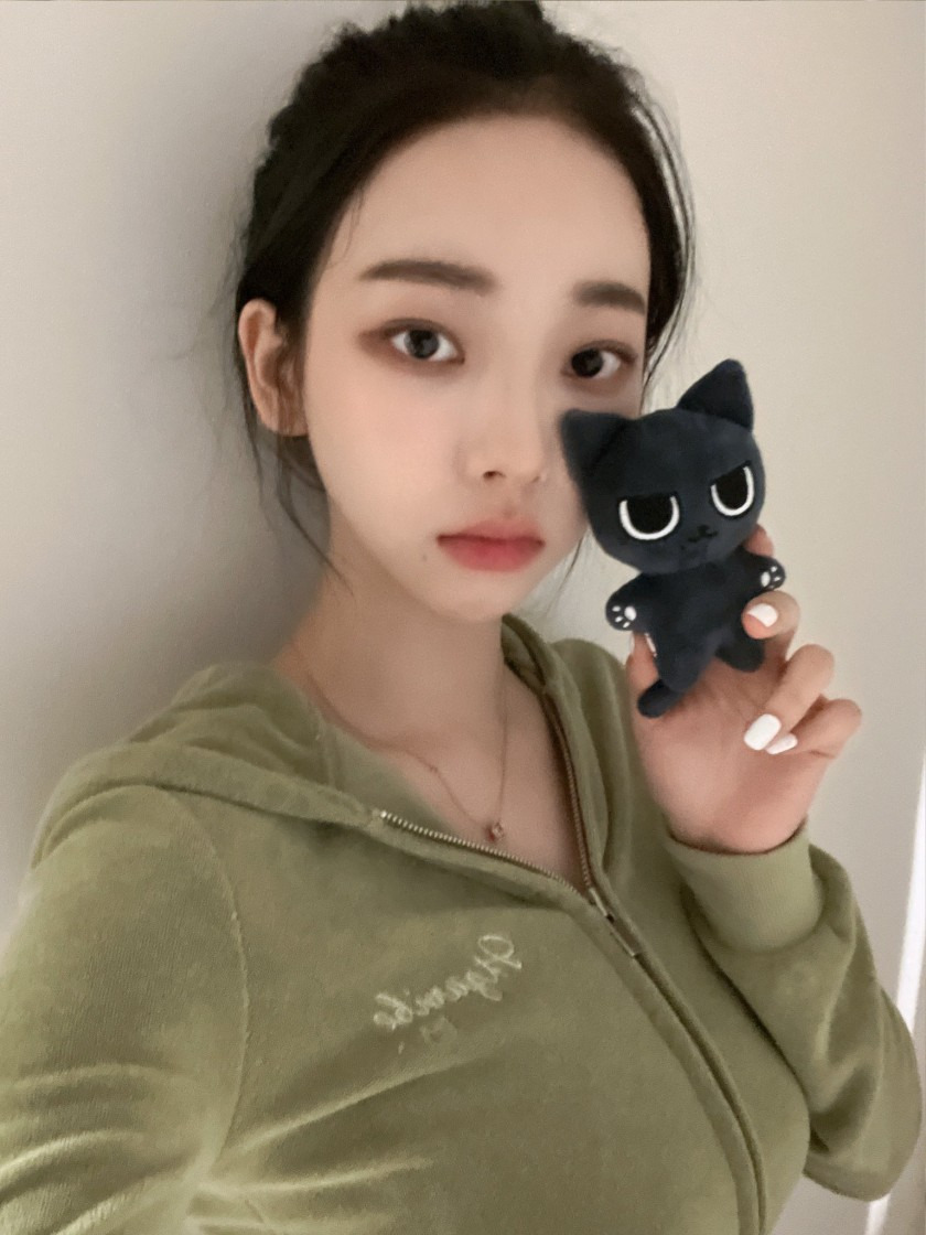 올리브 그린색 벨벳 후드티...묵직한 에스파 카리나