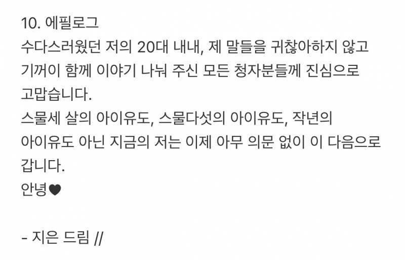 역대 음원 스트리밍 1위, 다운로드 1위, 국내 여가수 최대 규모 콘서트라는 타이틀을 얻은 20대를 드디어 마무리 짓게 됨