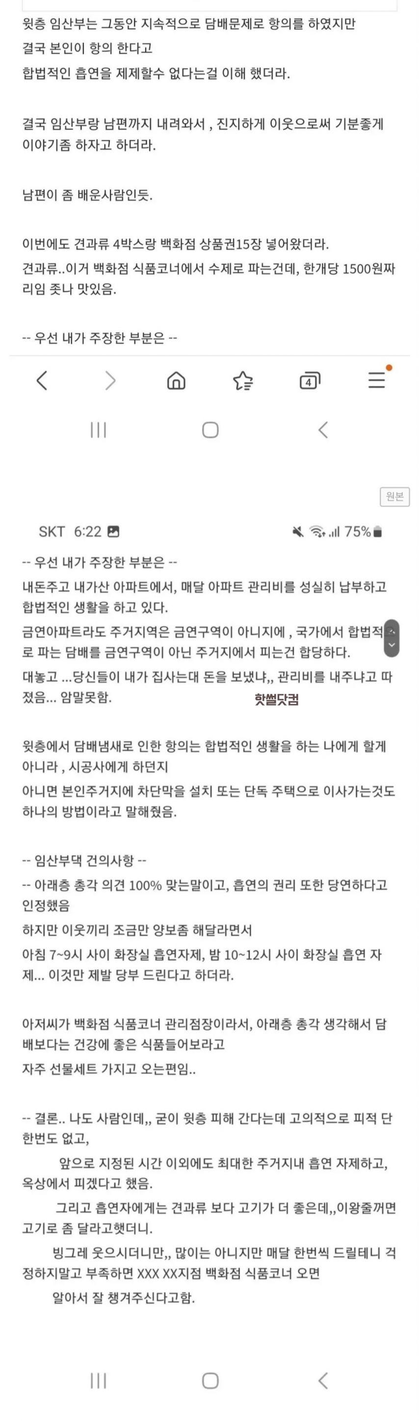 위층 임산부랑 담배냄새때문에 합의봫
