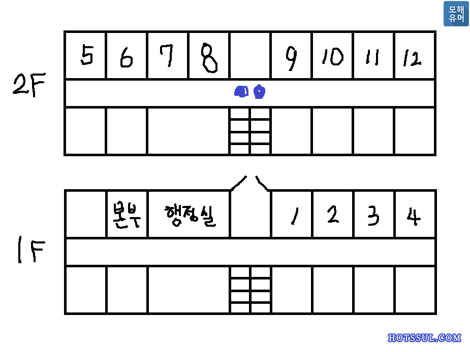불침번은 2층 중앙에 파란색 원 부분에서 근무를 섰으며 중앙통로를 제외한 양 끝 통로와 다른 방들은 모두 잠궈놓기 때문에