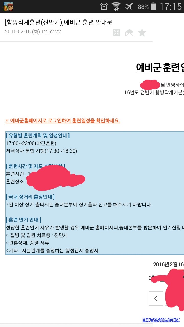 이번에는 설도있고 친구결혼식 때문에 귀국했는데 2월에 메일로 3월 16일 17시에 훈련있음 이러길래 ㅇㅋ 하고 있다가
